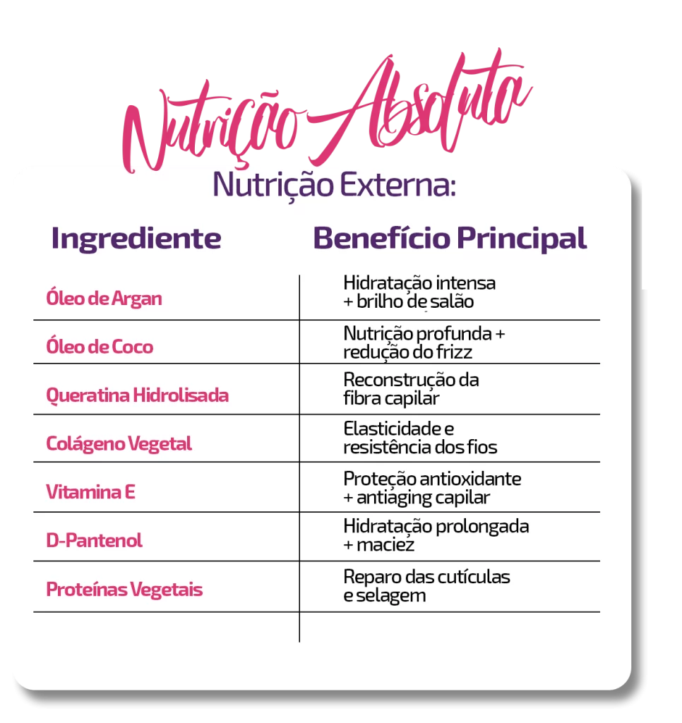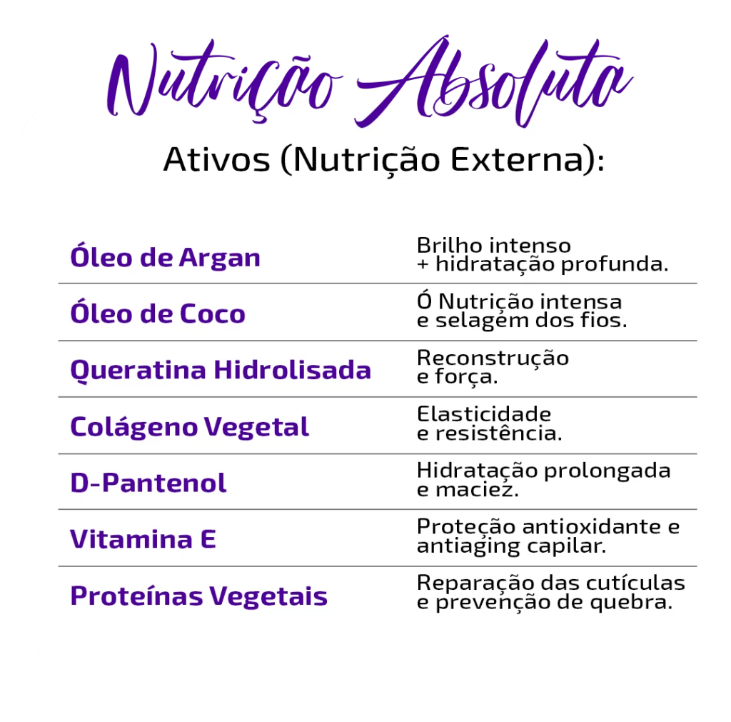 Nutrição Absoluta: Aplicar nos fios antes de dormir, massageando bem do comprimento às pontas.
