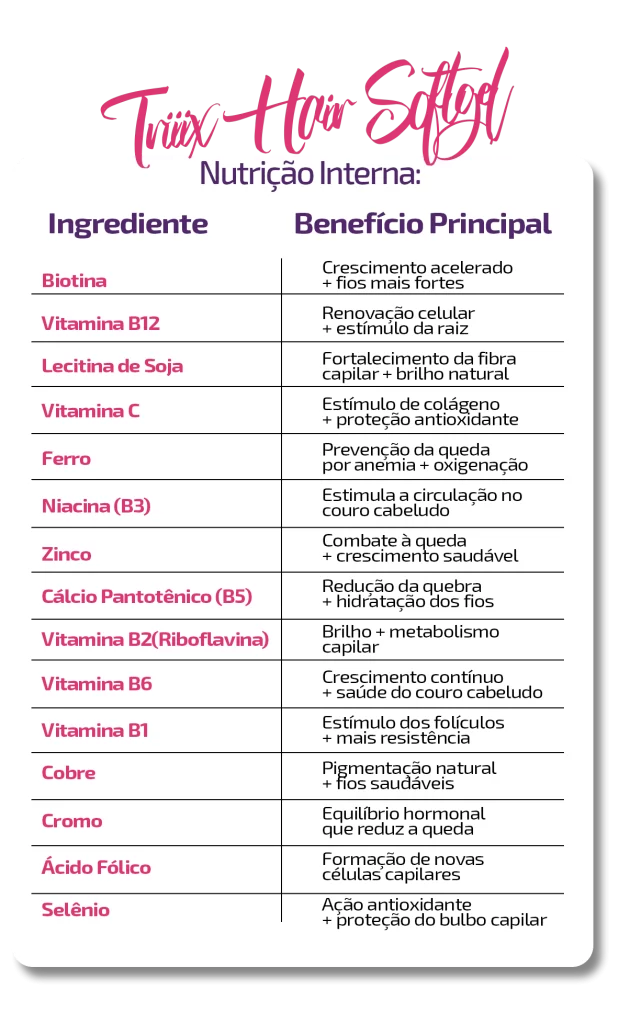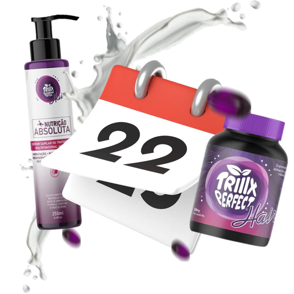 É a combinação do Triiix Hair Softgel, suplemento em cápsulas de alta absorção que nutre de dentro pra fora, com o Nutrição Absoluta, sérum capilar noturno que regenera e hidrata de fora pra dentro. Juntos, fortalecem cabelos, pele e unhas, reduzem a queda, preenchem falhas, melhoram a elasticidade e deixam os fios com brilho de salão.